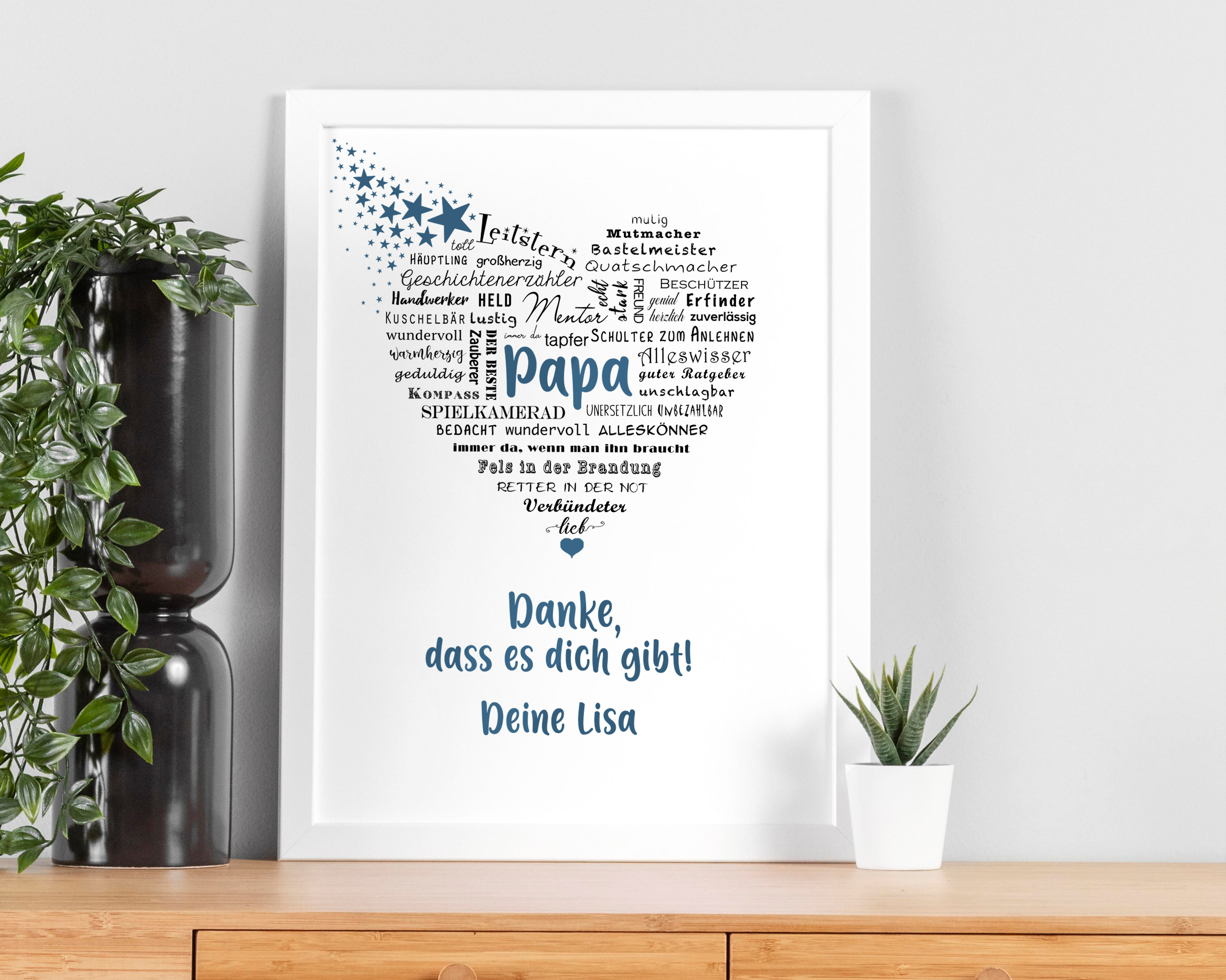 personalisiertes Bild mit einem Herz aus Worten und Sternen in leuchtendem Blau für einen der liebesten Menschen - unseren Papa - zum Geburtstag, zu Weihnachten, als rührendes Dankeschön oder besondere Aufmerksamkeit
