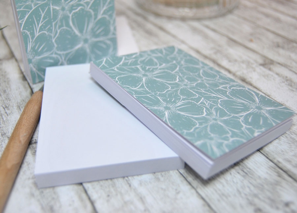 Schöner, dezenter Notizblock im floralen Design in hellem Blaugrau