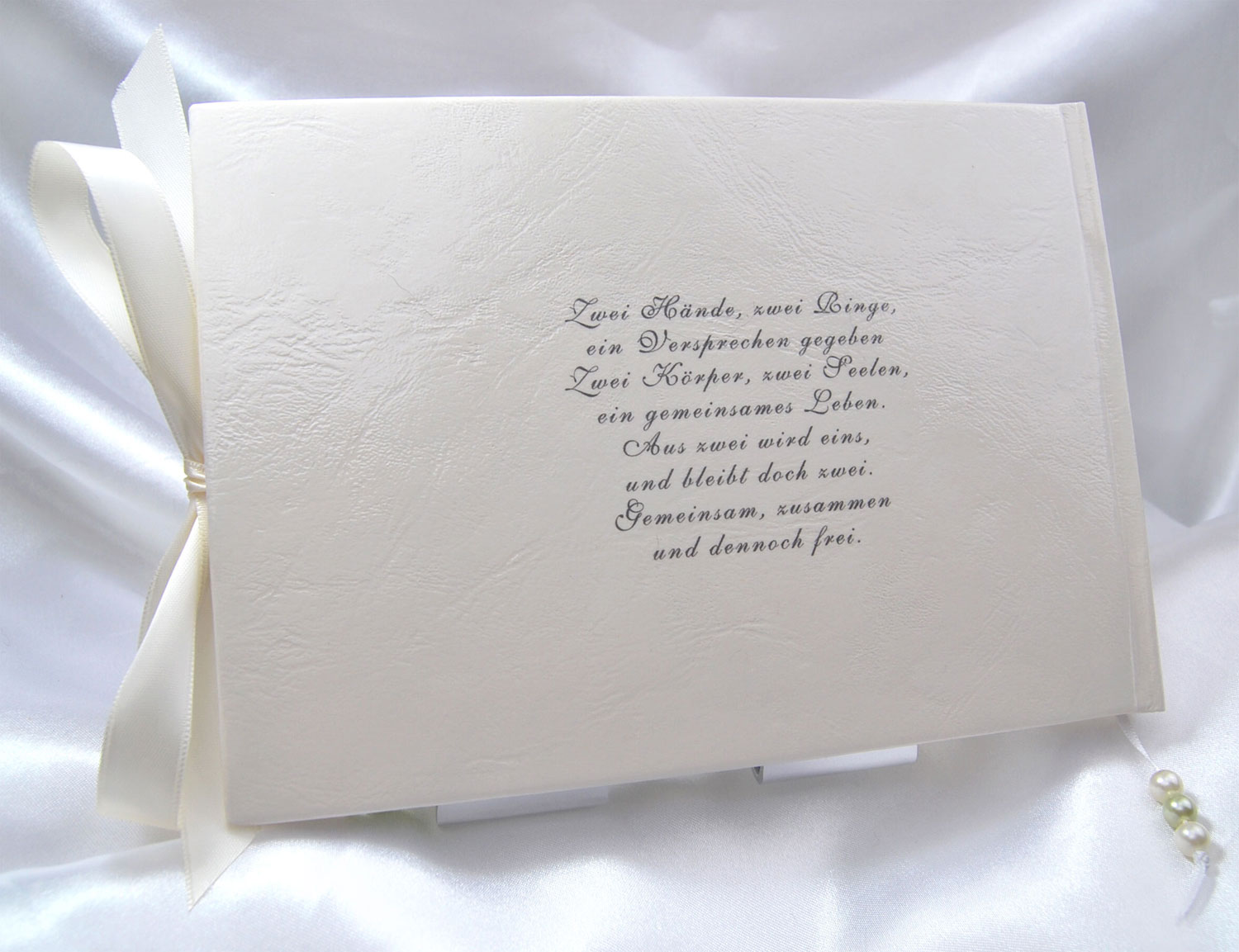 Spruch Ihrer Wahl auf dem Buchcover des Hochzeitsgästebuches