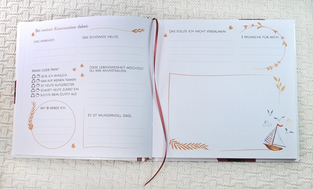 Das individualisierte Album zur Kommunion kann als Blanko-Variante oder mit Einleitung und leeren Seiten sowie mit Einleitung und Fragen zum Ausfüllen angefertigt werden. Alle Varianten bieten Ihnen und Ihren Gästen viel Platz für eigene Worte und viele Fotos.