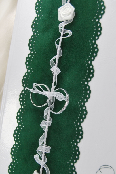 Silberne Trauringe auf dunkelgrünem Velours und weißem Zierband