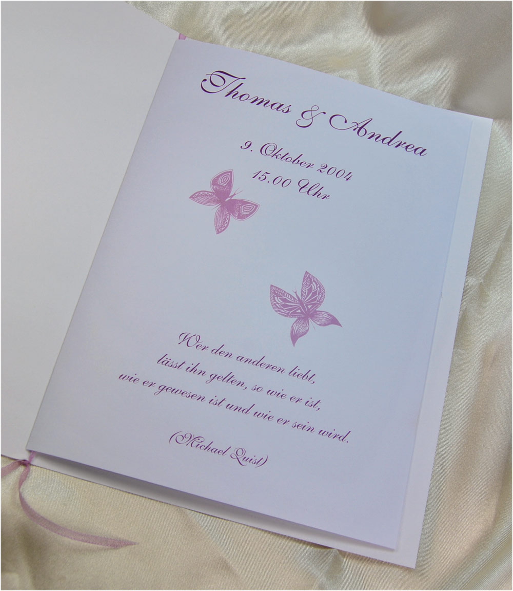 Verspieltes Kirchenheft zur Hochzeit aus Strukturkarton in Lederoptik mit Ranken und Schmetterlingen in zartem Flieder.