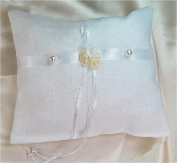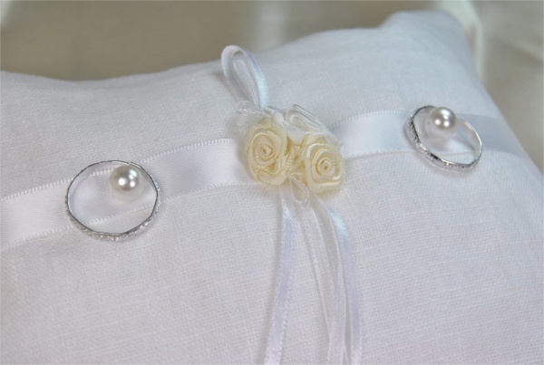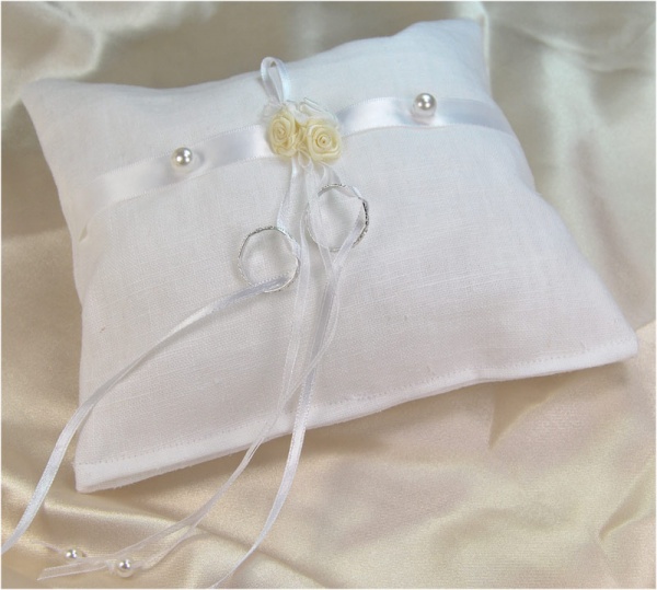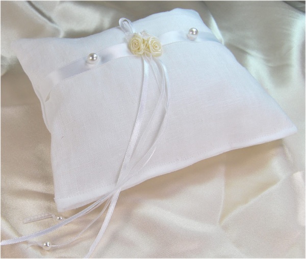 Wunderschönes Ringkissen zur Hochzeit ganz in Weiß aus feinem Leinenstoff mit viel Liebe von Hand gefertigt und mit edlen Bändern aus Satin und Organza verziert. Zwei kleine Perlen zieren das dezent schimmernde Organzabändchen. Die Trauringe können entweder an den weißen Satinbändern befestigt oder einfach auf zwei Perlen gesteckt werden. Ein kunstvolles Röschenboququet aus Satin und kleinen Organzablättchen rundet das Ringkissen zu Hochzeit ab.
